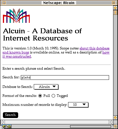 These records were then imported into a newly created DRA database and made available through Kambitsch's gateway scripts. This is a screen shot of the Alcuin database as it appears in a WWW browser's window. The database itself is available itself at http://library.ncsu.edu/drabin/alcuin/. Using this interface you should be able to search the contents of the Alex database. The database consists of MARC records containing URLs in the 856 fields. The interface this service works through is based on Tim Kambitsch's DRA/WWW gateway scripts and translates the contents of subfield u of 856 fields into "hot links."